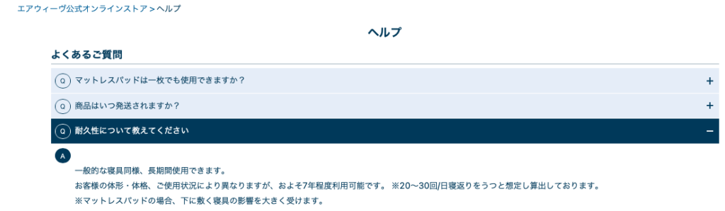 エアウィーヴの寿命について、公式サイトを確認してみました。